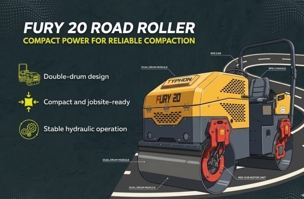 Enter the TYPHON Fury 20 Mini Road Roller — a compact, 2-ton powerhouse designed to deliver up to 35 kN of excitation force in restricted-access job sites. With a small footprint, hydraulic drive, and advanced vibration system, the Fury 20 combines maneuverability, power, and operator comfort, making it the go-to solution for tight-space construction. In this article, we explore the five most common confined construction scenarios where the Fury 20 shines and explain why it has become an essential tool for contractors who demand performance without compromise.
